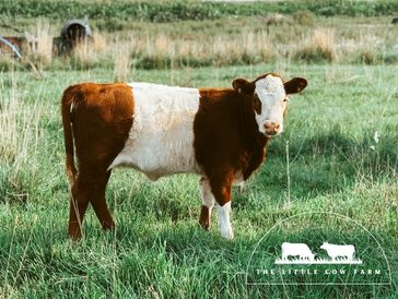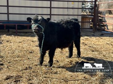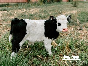 Dusty is the newest calf at The Little Cow Farm born 8/3/2025! He is a black and white belted panda bull calf. We believe he is chondro positive but are waiting on hair testing to confirm. He is out of our cow Delta Dawn and by our bull Ferdinand! He has a very sweet disposition!