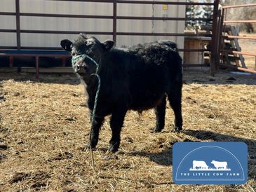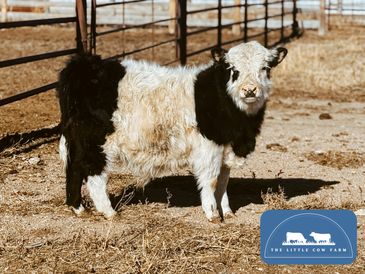 Lightning is a black and white panda bull. He was born 9/19/2025 and is out of our cow Rock Star and by our bull Ferdinand! He is ready to wean and find his forever home! He is chondro positive!