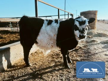 Dusty is a black and white panda bull born on 8/3/2025! He is chondro positive which means he will stay smaller. He is out of our cow Delta Dawn and by our bull Ferdinand!